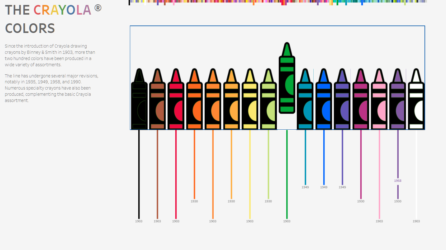Look at all the colors of the standard 16-box crayola along with the production history of each color with this tableau dashboard.